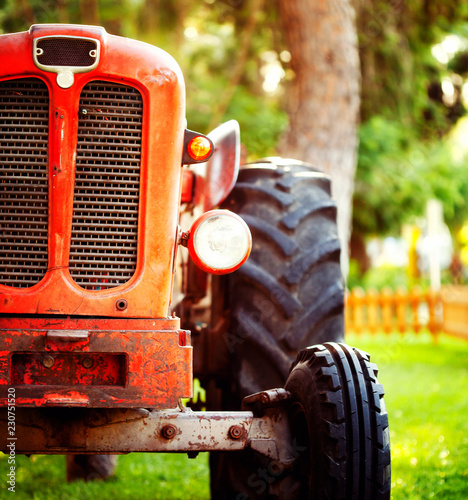 © orelphoto, Fototapeta premium Croppped photo of old vintage red tractor standing on a farm field at sunset.