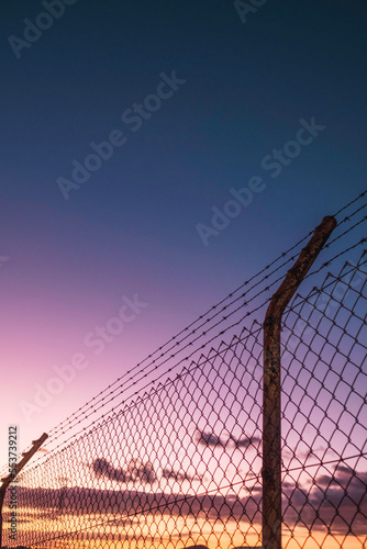 © Marcos, Obraz premium cross-border fence at sunset.border between countries.