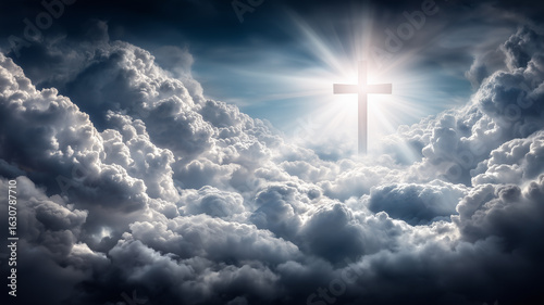Fototapeta premium Cross illuminated by divine sunbeams breaking through dramatic storm clouds,...