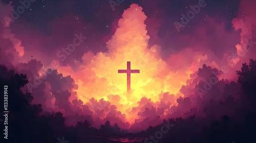 © Siasart Studio, Obraz premium Cross in Fiery Sunset Sky, Hopeful Night, Peaceful Spiritual Journey, Divine Light