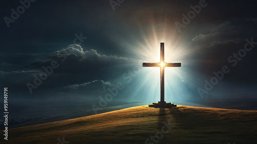 © SeanJVision, Naklejka premium Cross lighting up the night on top of a mountain