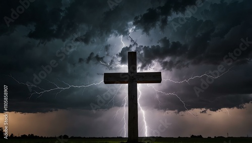 © claudunia, Naklejka premium Cross lit by lightning in a stormy sky, symbolizing faith.