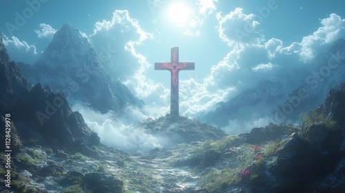 © Hvkk, Naklejka premium cross of jesus christ with shroud on the sky with clouds digital painting