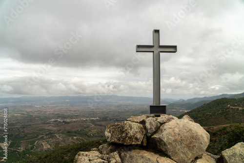 © MiguelAngel, Fototapeta premium Cross on the hill on a cloudy winter day