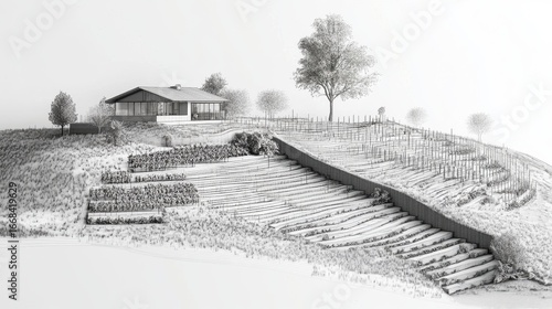 Fototapeta premium Cross-section 3D blueprint of a terraced hillside vineyard with integrated...