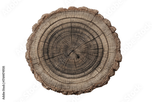 Fototapeta premium Cross-section of a weathered tree trunk, revealing concentric growth rings and a dark, cracked center