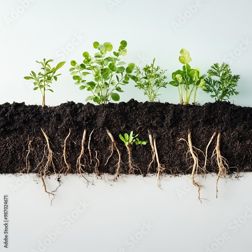 Fototapeta premium Cross-section of soil with various plants and roots thriving in different layers, biodiversity concept