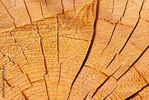 Fototapeta premium Cross-section of spruce trunk, with annual rings and cracks. wood texture