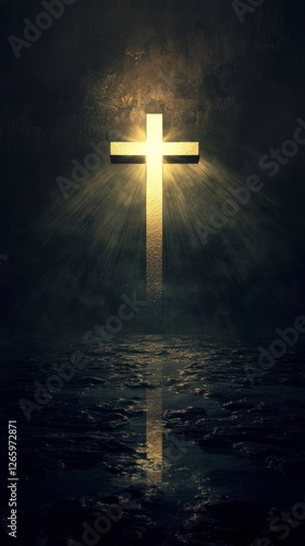 Fototapeta premium Cross shining with light from above, illuminating the darkness below. The...