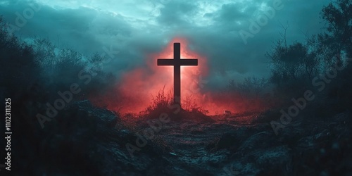 Fototapeta premium cross silhouette with dramatic sky and radiant light behind spiritual and...