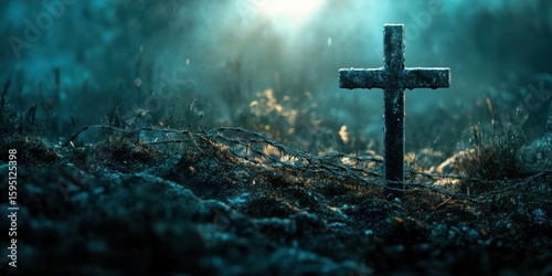 Naklejka premium Cross surrounded by mist and frost in a tranquil landscape at dawn creating...