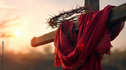 Fototapeta premium Cross with Crown of Thorns and Red Cloth at Sunset Remembrance