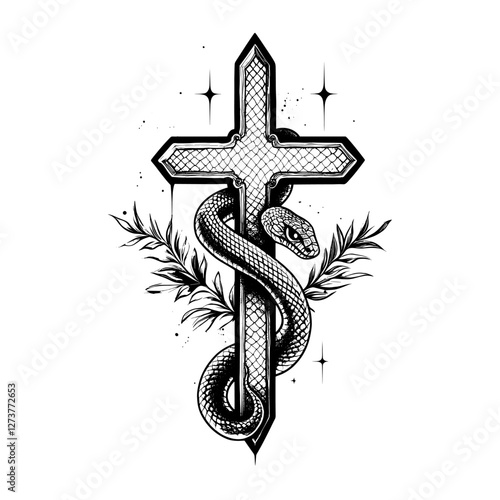 Obraz premium Cross with snake tattoo illustration black white vector