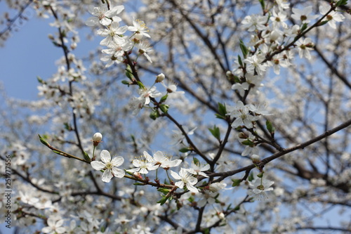 © Anna, Obraz premium Crossed branches of blossoming Prunus cerasifera tree against blue sky