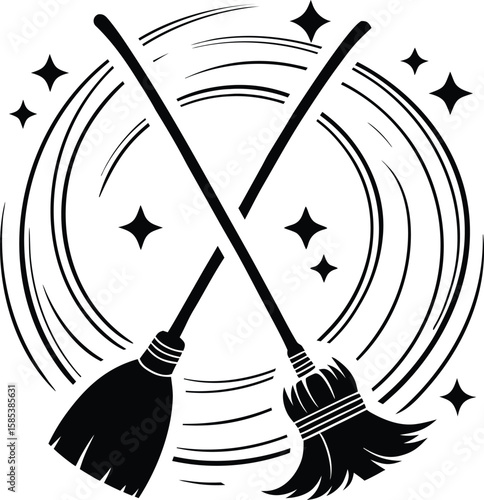 Fototapeta premium Crossed Magical Brooms with Swirl and Sparkles in Silhouette