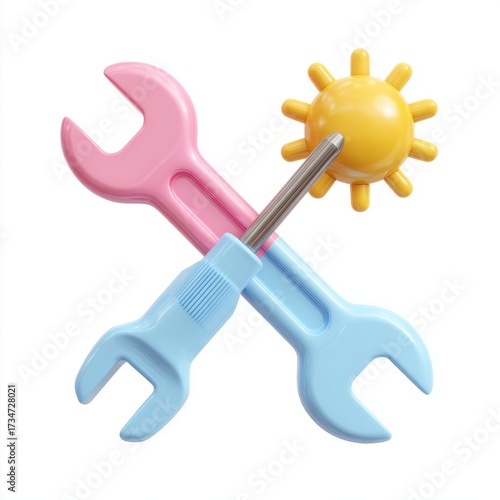 Obraz premium Crossed wrenches and a sun icon with a screwdriver tool