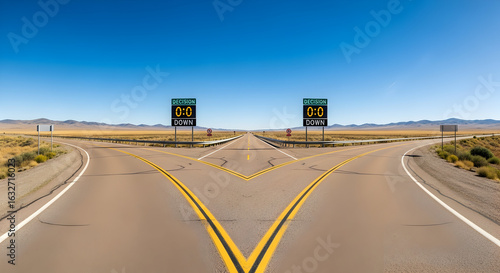 Fototapeta premium Crossroads Of Choices In A Vast Arid Landscape Under A Clear Blue Sky
