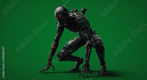 Fototapeta premium Crouching Robot on Green Background - Futuristic Machine