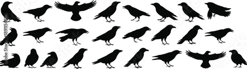 © Creatives Selim, Fototapeta premium Crow black bird silhouettes collection, flying perched raven crow poses, wildlife animal vector illustration isolated set design bundle
