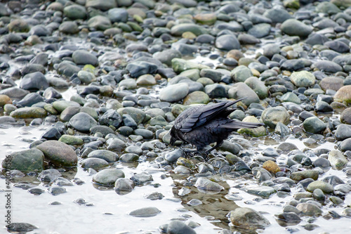 © Diane, Obraz premium Crow feeding on a rocky beach