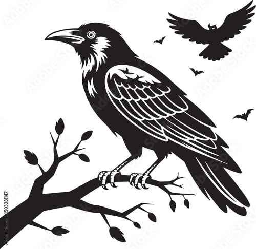 Obraz premium Crow or Raven Perched on Branch Halloween Bird Silhouette