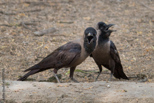 © MANISH, Obraz premium Crow Pair Engaging in Close Vocal Interaction. Crows Communicating Through Loud Calls in Natural Habitat