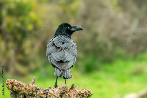 © fsanchex, Obraz premium crow perched on a log cloudy day