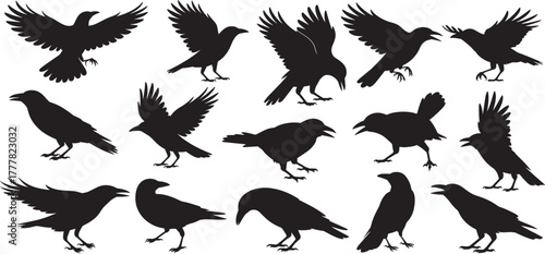 Obraz premium Crow silhouette vector set, crow and raven silhouette set flying and standing birds vector illustrator
