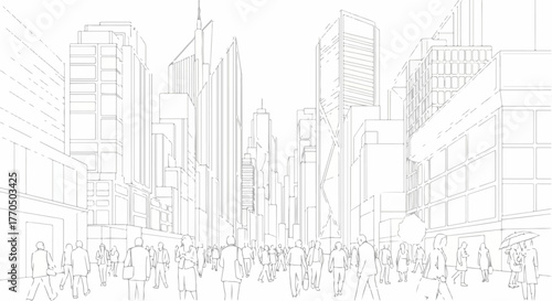 © yazidkautsar1, Fototapeta premium Crowded city skyline with people silhouette urban line art illustration.