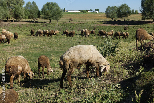 Fototapeta premium crowded flock of sheep grazing on green pasture