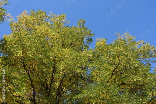 © Anna, Fototapeta premium Crown of Sophora japonica against blue sky in October