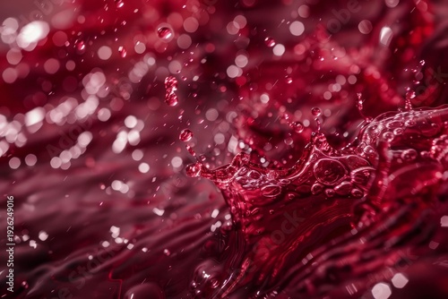 Naklejka premium Crown shaped red wine is splashing, creating drops and bubbles with beautiful bokeh in the background