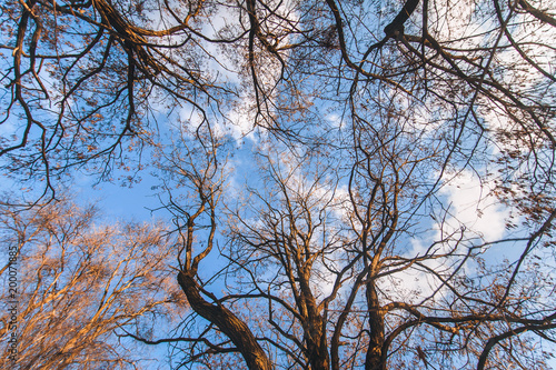 Obraz premium Crown trees. Bottom view. Wide angle photography.