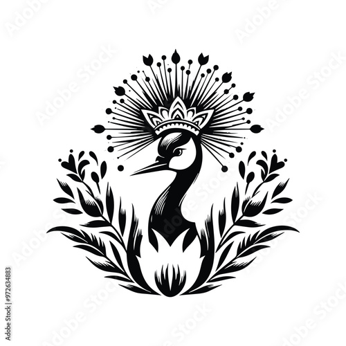 © Cici, Obraz premium Crowned Crane bird in folk art black and white silhouette illustration