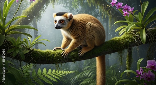 © saida, Obraz premium Crowned Sifaka Lemur Perched on Branch in Lush Rainforest.