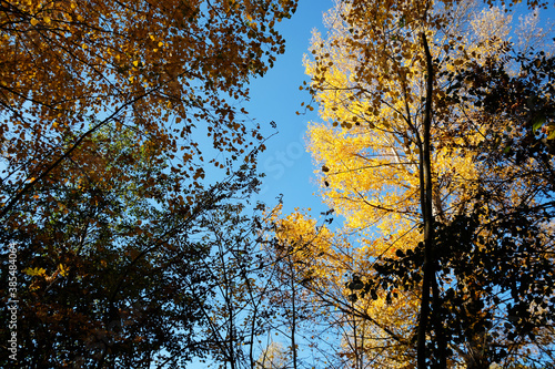 Fototapeta premium Crowns of autumn trees from bottom to top against a bright blue cloudless sky