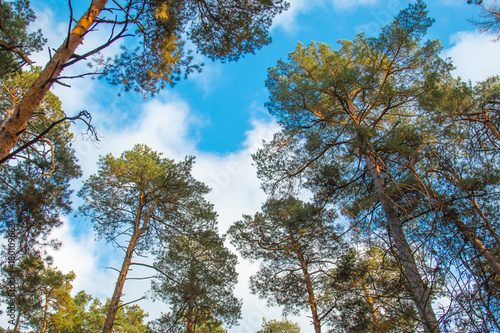 Obraz premium Crowns of coniferous trees against a bright blue sky in the forest
