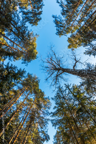 © fabrikanes, Obraz premium Crowns of trees, view from below.