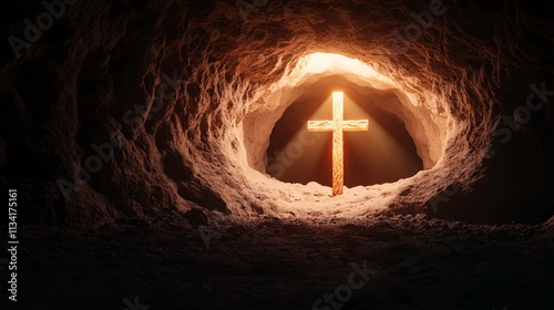 Naklejka premium Crucifix faith religion wood concept. A glowing cross illuminated inside a dark cave, symbolizing hope and faith.