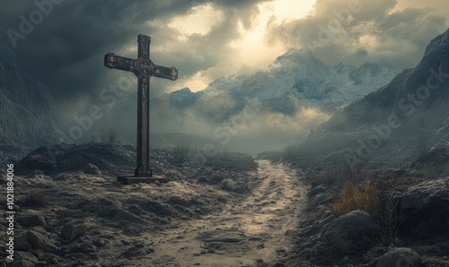 Fototapeta premium Crucifix in a Dramatic Mountainous Environment. Atmospheric Christian Concept