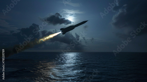 Fototapeta premium Cruise Missile Flight at Twilight Over Ocean Missile in Night Sky Over...