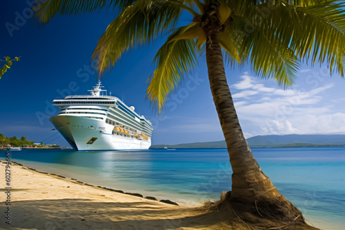 Fototapeta premium cruise ship to paradisiacal beach with palm tree, travel, luxury, generative ai