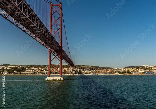 Fototapeta premium Cruising up the Tagus river and sailing under the bridge named after the 25th...