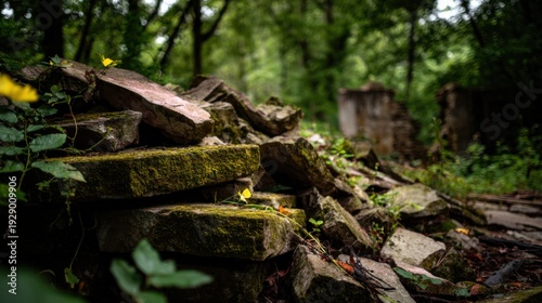 Fototapeta premium Crumbled Stone Wall Fragments in Overgrown Forest Setting