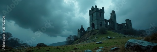 Obraz premium Crumbling gothic castle ruins under stormy sky, dark fantasy, gothic romance