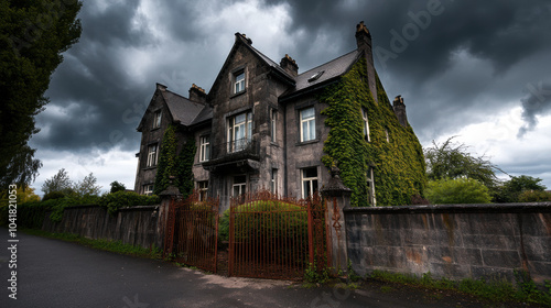 Fototapeta premium Crumbling mansion with ivy covered walls under dark clouds evokes sense of...