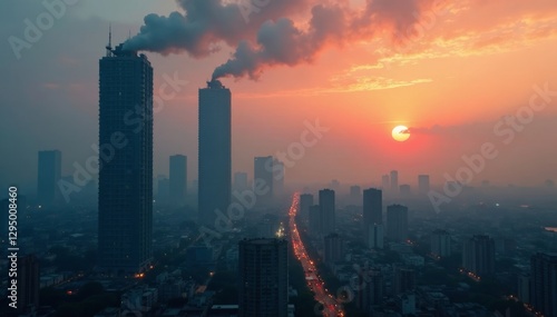 © Jesse, Fototapeta premium Crumbling skyscrapers pierce smog-choked dusk, infrastructure decaying , pollution, decay