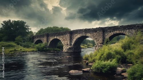 © julimur, Fototapeta premium Crumbling stone bridge over a black river, with creeping mist and distant thunderclouds