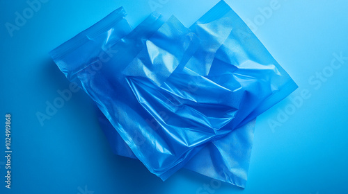 © Sadia, Obraz premium Crumpled blue plastic sheets arranged artistically on a solid blue background