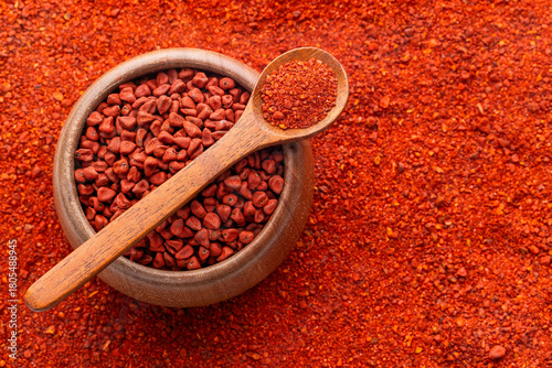 Fototapeta premium Crushed annatto seeds in the spoon and in the bowl - Bixa Orellana